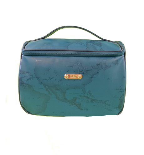 Beauty case da viaggio in tessuto tecnico idrorepellente con stampa Geo,color verde petrolio, chiusura con zip e manico, Made in Italy. Grazie alla forma squadrata e alla dimensione grande, è in grado di contenere cosmetici e make up in quantità. Perfetto da regalare e da regalarsi.